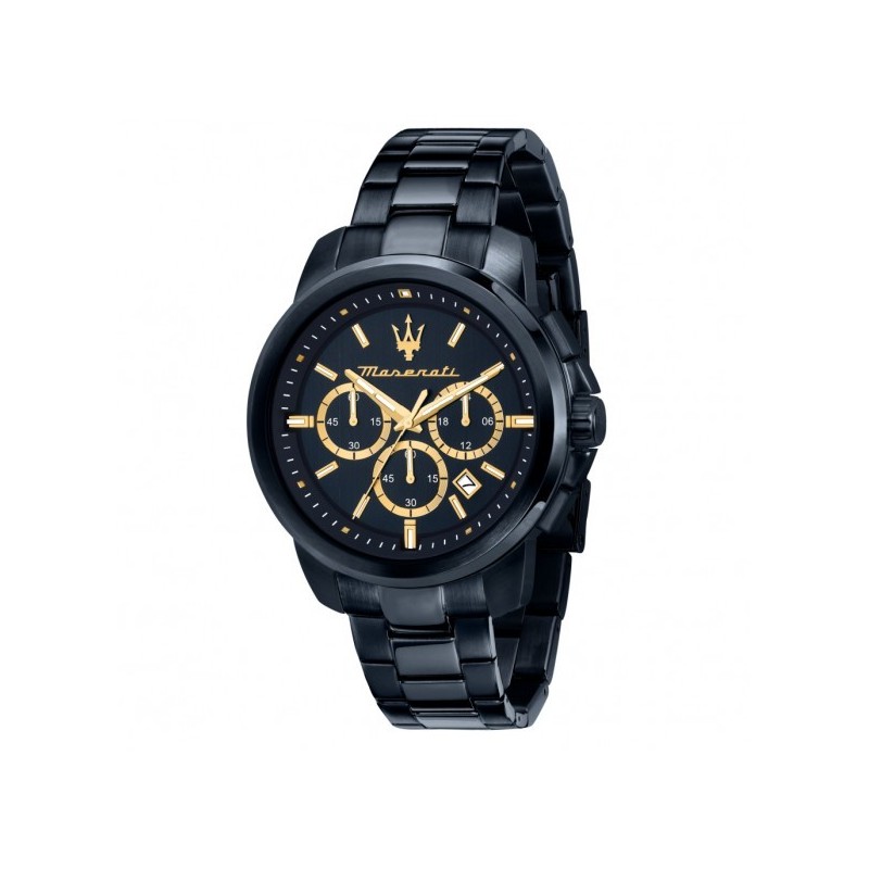 Maserati Herrenarmbanduhr aus der Blue Edition Kollektion mit TMI VS53 Quarzwerk und Chronographenfunktion mit Datumsanzeige. Rundes Edelstahlgehäuse mit blauer Beschichtung, 44 mm Durchmesser und 11,20 mm Dicke, mit Schnappdeckel. Blaues analoges Zifferblatt mit goldfarbenen Strichindizes, Logo bei 12 Uhr und Datumsanzeige zwischen 4 und 5 Uhr, Mineralglas. Blaues Edelstahlarmband mit Druckknopf-Faltschließe, wasserdicht bis 10 ATM.