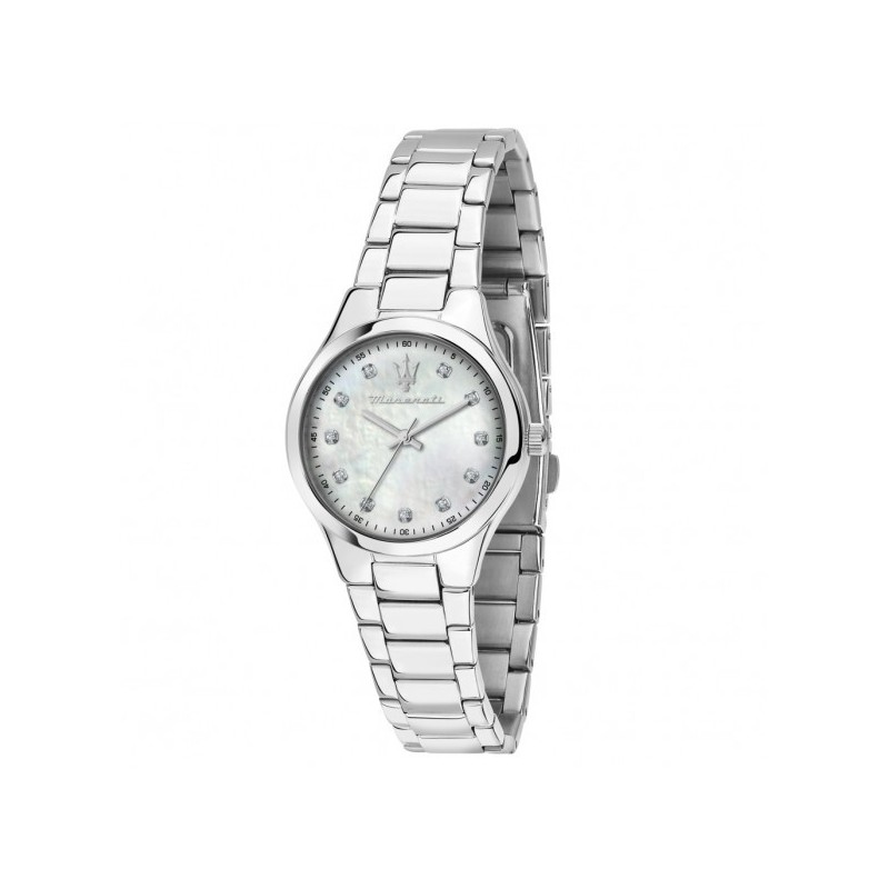 Maserati Damenarmbanduhr aus der Attrazione Kollektion mit Miyota Quarzwerk (2015) und reiner Zeitanzeige. Rundes, silberfarbenes Edelstahlgehäuse mit 30 mm Durchmesser und 8,05 mm Dicke. Analoges Perlmuttzifferblatt mit weißen Kristallindizes und Logo bei 12 Uhr, Mineralglas. Silberfarbenes Edelstahlarmband mit Druckknopf-Faltschließe. Wasserdicht bis 5 ATM: spritzwassergeschützt, aber nicht druckfest.