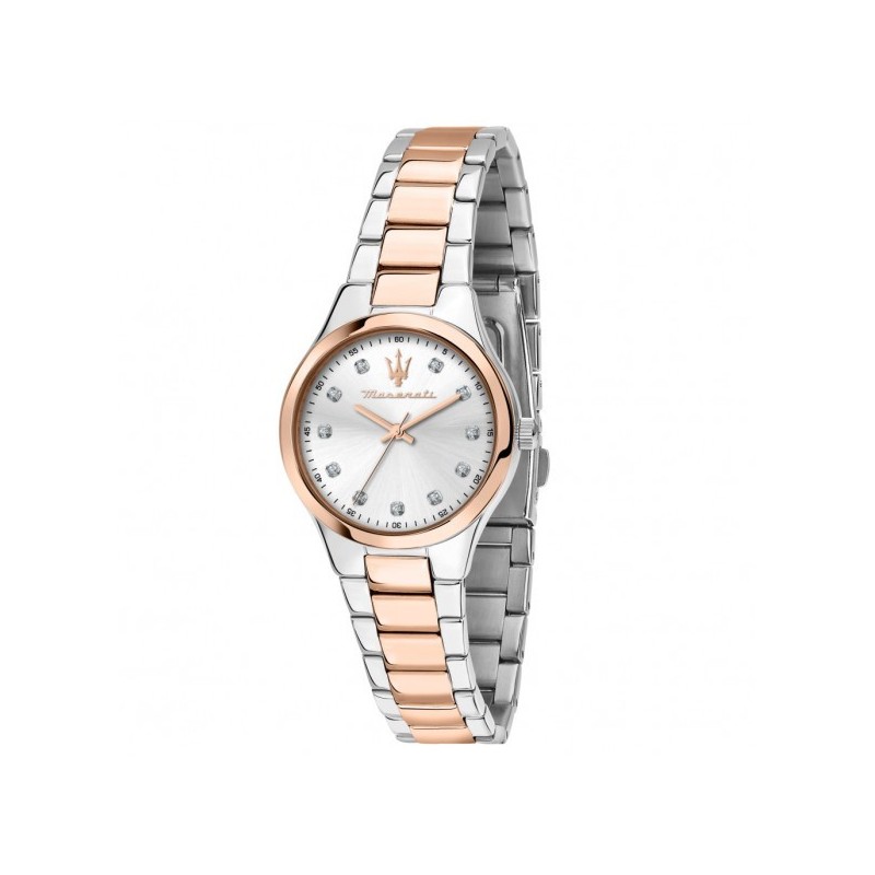 Maserati Damenarmbanduhr aus der Attrazione Kollektion mit Miyota Quarzwerk (2015) und reiner Zeitanzeige. Rundes, silberfarbenes Edelstahlgehäuse, 30 mm Durchmesser und 8,05 mm dick. Roségoldplattierte Lünette. Silbernes Zifferblatt mit analoger Anzeige, weißen Kristallindizes und Logo bei 12 Uhr, Mineralglas. Zweifarbiges Edelstahlarmband in Silber und Roségold mit Druckknopf-Faltschließe. Wasserdicht bis 5 ATM: spritzwassergeschützt, aber nicht druckfest.