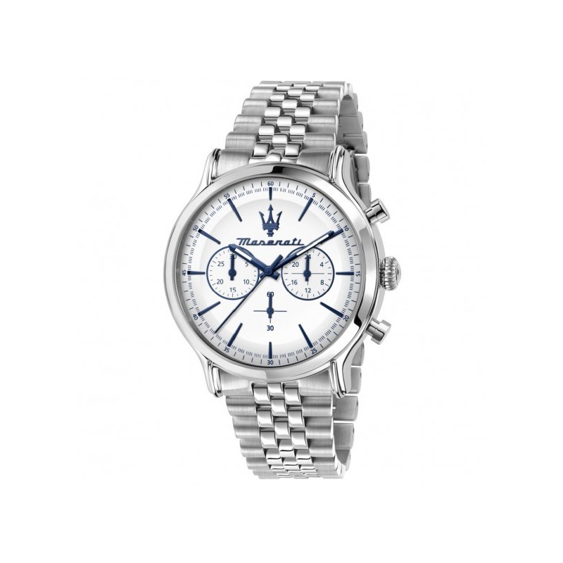 Maserati Herrenarmbanduhr aus der Epoca Kollektion mit Miyota JS20 Quarzwerk und Chronographenfunktion. Rundes, silberfarbenes Edelstahlgehäuse mit polierter Oberfläche, 42 mm Durchmesser und 11,35 mm Dicke, verschraubter Gehäuseboden. Weißes analoges Zifferblatt mit blauen Strichindizes und Logo, Mineralglas. Silberfarbenes Jubilee-Mesh-Armband aus Edelstahl mit Druckknopf-Faltschließe, wasserdicht bis 10 ATM.