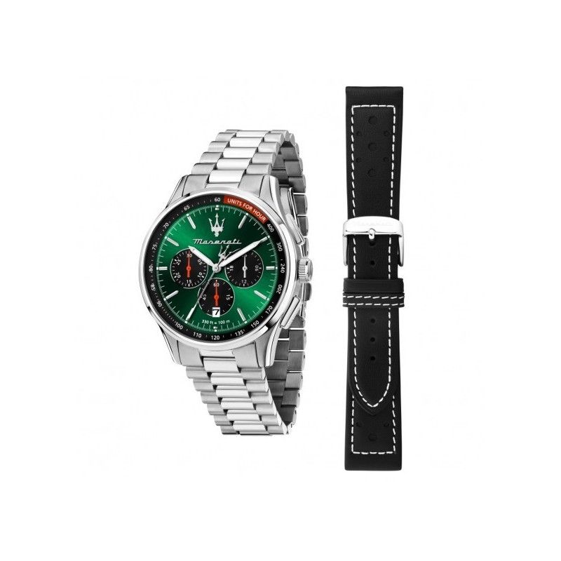Maserati Herrenarmbanduhr aus der Sorpasso Kollektion mit Miyota JS25 Quarzwerk und Chronographenfunktion mit Datumsanzeige. Rundes, silberfarbenes Edelstahlgehäuse, 42 mm Durchmesser und 13,40 mm dick. Verschraubter Gehäuseboden und verschraubte Krone für erhöhte Wasserdichtigkeit. Grünes analoges Zifferblatt mit Strichindizes, Logo bei 12 Uhr, Datumsanzeige bei 6 Uhr, Mineralglas. Silberfarbenes Edelstahlarmband mit Druckknopf-Faltschließe. Ein zusätzliches schwarzes Lederarmband mit Dornschließe ist im Lieferumfang enthalten. Wasserdicht bis 10 ATM.