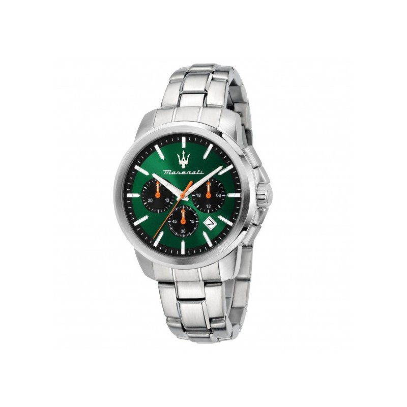 Maserati Herrenarmbanduhr aus der Successo-Kollektion mit Miyota JS25 Quarzwerk und Chronographenfunktion mit Datumsanzeige. Rundes, silberfarbenes Edelstahlgehäuse, 42 mm Durchmesser und 10,70 mm Dicke. Grünes analoges Zifferblatt mit Strichindizes, Logo bei 12 Uhr und Datumsanzeige zwischen 4 und 5 Uhr, Mineralglas.