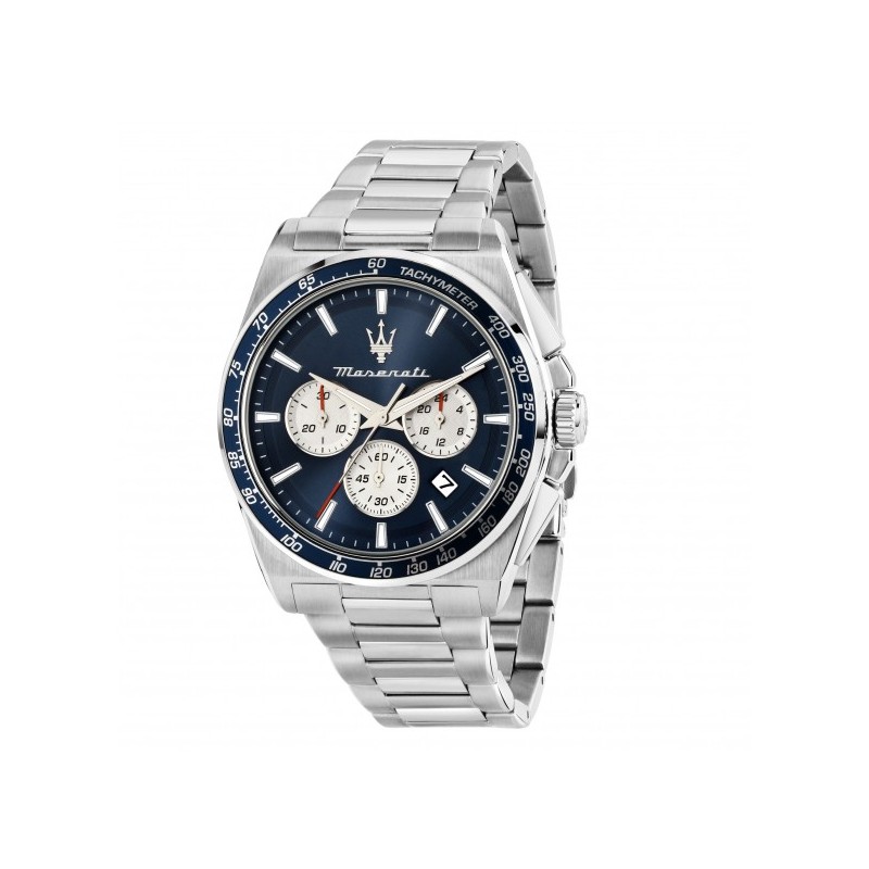 Maserati Herrenuhr aus der Velocità Kollektion mit Miyota JS25 Quarzwerk und Chronographenfunktion mit Datumsanzeige. Rundes, silberfarbenes Edelstahlgehäuse, 43 mm Durchmesser und 11,90 mm Dicke. Blaue, emaillierte Tachymeterlünette. Blaues analoges Zifferblatt mit Strichindizes, Logo bei 12 Uhr und Datumsanzeige zwischen 4 und 5 Uhr, Mineralglas.