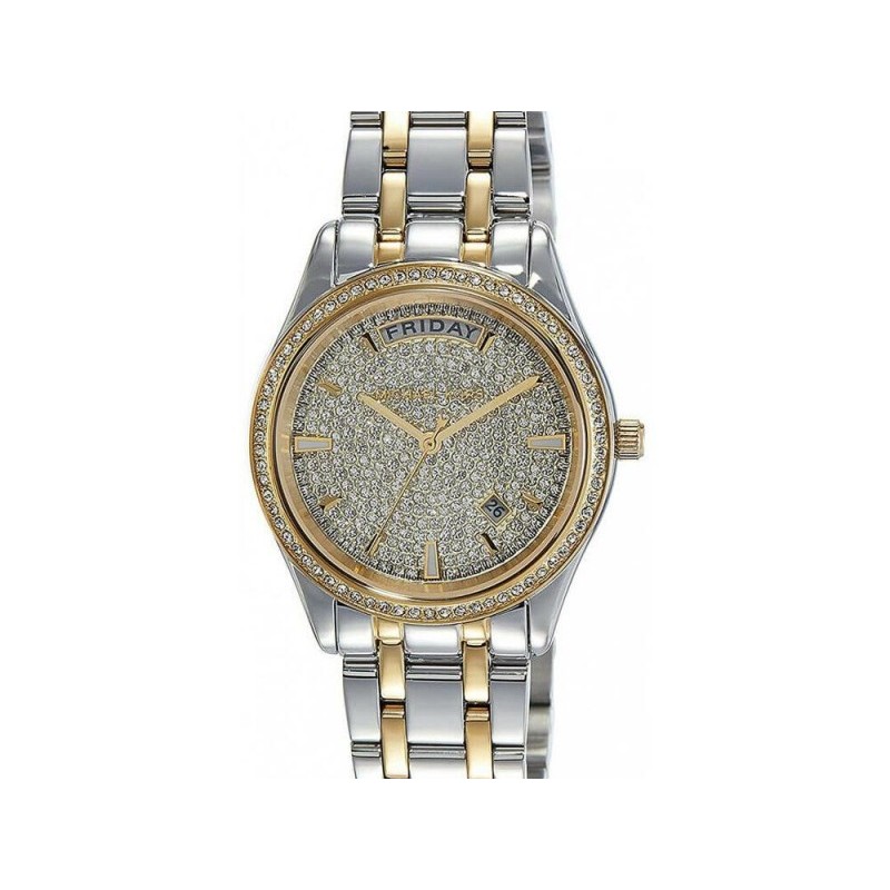 Michael Kors Kiley MK6481 analoge Damen-Modearmbanduhr mit batteriebetriebenem Quarzwerk japanischer Bauart, Edelstahlgehäuse mit 34 mm Durchmesser in Silber und Gold mit Kristallrahmen, rundes, poliertes Zifferblatt mit Stabindizes und Tagesfunktion und Datum, Mineralglas und zweifarbig gold- und silberfarbenes Edelstahlarmband mit Faltschließe, 5 ATM wasserdicht