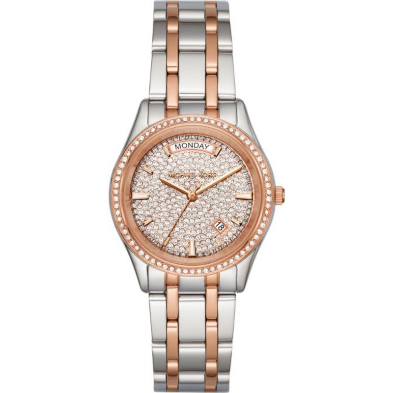 Michael Kors Kiley MK6482 analoge Damenmode-Armbanduhr mit batteriebetriebenem Quarzwerk japanischer Art, Edelstahlgehäuse mit 34 mm Durchmesser zweifarbig silber und roségold mit Kristallrahmen, kreisförmiges poliertes Zifferblatt mit Stabindizes und Funktion Datum und Tag, Mineral Glas und zweifarbiges Edelstahlarmband in Silber und Roségold mit Faltschließe, 5 ATM wasserdicht