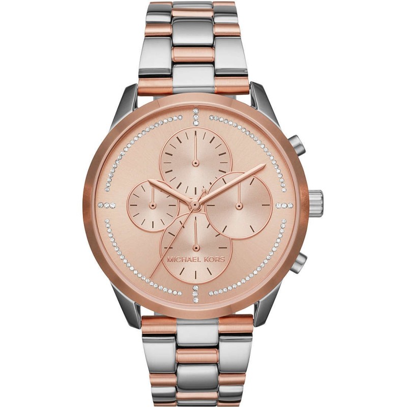 Michael Kors MK6520 Damen-Chronograph Modell Slater - runde Form, Mineralglas, analoge Anzeige, 40-mm-Gehäuse aus Stahl, roségoldfarbenes rundes Zifferblatt mit Strichindizes und Vorhandensein von Kristallen, zweifarbiges silberfarbenes und roségoldenes Stahlarmband mit verdecktem Verschluss , batteriebetriebenes Quarzwerk, wasserdicht 5 atm