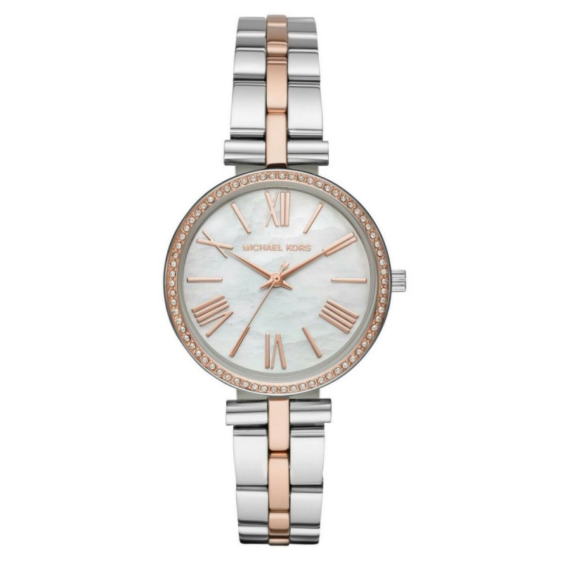 MICHAEL KORS MACI WATCH – MK3969 – Geschlecht: Frau, Gehäusematerial und -oberfläche: Stahl, Gehäusegröße: 34 mm, Gehäusedicke: 8 mm, Gehäuseoberfläche: Poliert, Gehäusefarbe: Silber, Weiß, Perlmuttzifferblatt mit Ziffern Romans Roségoldfarbe, Bandmaterial: Stahl, Bandfarbe: Silber und Roségold, Schließe: Faltschließe, Uhrwerk: Quarz, wasserdicht: 5 ATM