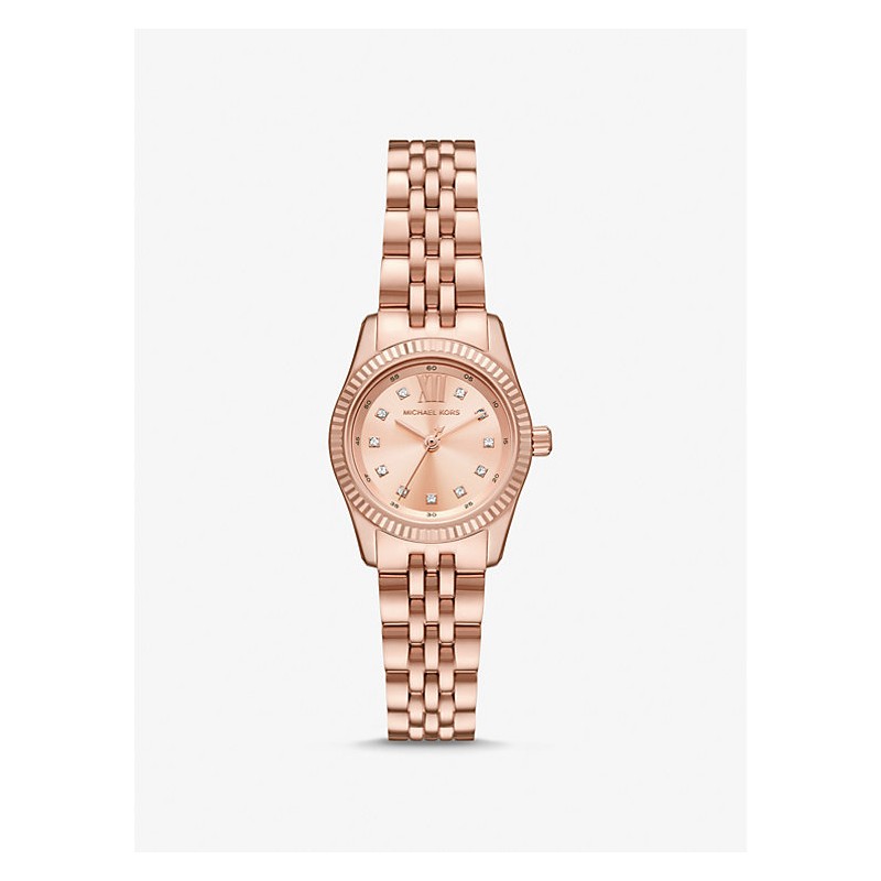 Michel Kors Damenarmbanduhr aus der Petite Lexington Kollektion mit Quarzwerk und reiner Zeitanzeige. Rundes Gehäuse aus roségoldfarbenem Edelstahl, 26 mm Durchmesser und 8 mm dick, gerändelte Lünette aus roségoldfarbenem Edelstahl und aufklappbarer Gehäuseboden aus Edelstahl. Rosafarbenes analoges Zifferblatt mit Edelsteinindizes und römischer Ziffer bei 12 Uhr, Logo oben, Mineralglas. Armband aus roségoldfarbenem Edelstahl mit Druckknopf-Faltschließe, wasserdicht bis 5 ATM: spritzwassergeschützt, aber nicht druckfest.