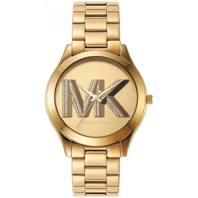 Michael Kors Damenarmbanduhr aus der Slim Runway Kollektion mit Quarzwerk und reiner Zeitanzeige. Rundes, goldfarbenes Edelstahlgehäuse, 42 mm Durchmesser, verschließbarer Edelstahlboden. Goldfarbenes analoges Zifferblatt ohne Indizes, zentrales Logo mit weißem Zirkonia verziert, Mineralglas. Goldfarbenes Edelstahlarmband mit Druckknopf-Faltschließe, wasserdicht bis 5 ATM: spritzwassergeschützt, aber nicht druckfest.