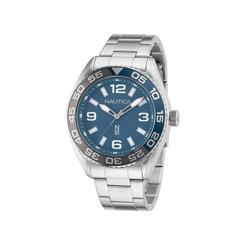 Nautica Herrenarmbanduhr aus der Finn World Kollektion mit Quarzwerk und reiner Zeitanzeige. Rundes, silberfarbenes Edelstahlgehäuse mit 44 mm Durchmesser. Schnappdeckel aus Edelstahl, blau emaillierte Edelstahllünette mit Minuteneinteilung. Blaues analoges Zifferblatt mit Strich- und arabischen Ziffern, Logo oben, Mineralglas. Silberfarbenes Edelstahlarmband mit Druckknopf-Faltschließe, wasserdicht bis 5 ATM: spritzwassergeschützt, aber nicht druckfest.