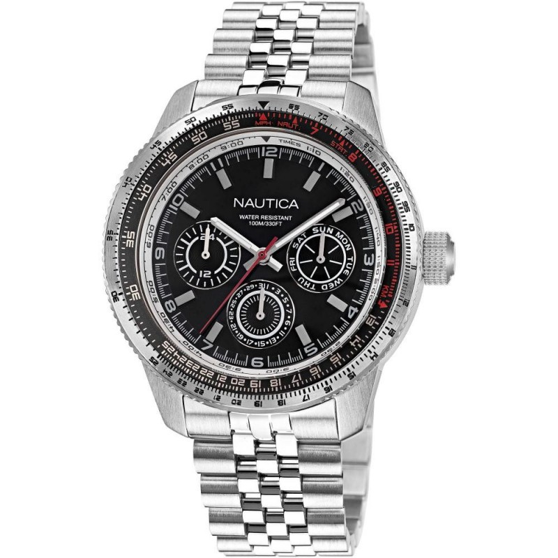 Nautica Herren-Multifunktionsarmbanduhr aus der Pier 39 Kollektion mit Quarzwerk. Rundes, silberfarbenes Edelstahlgehäuse mit Satin-Finish, 46 mm Durchmesser und 13,65 mm Dicke, verschraubter Gehäuseboden. Schwarzes analoges Zifferblatt mit Doppelstabindexen und arabischen Ziffern, Anzeigen für Tag, Monat und Jahr, Logo oben, Mineralglas. Silberfarbenes Edelstahlarmband mit Druckknopf-Faltschließe, wasserdicht bis 10 ATM.