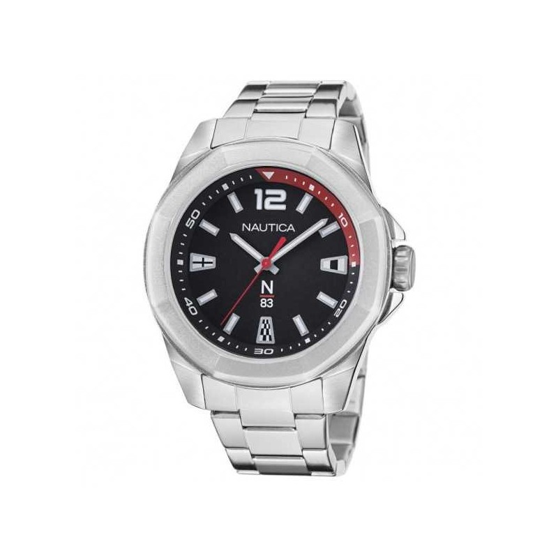 Nautica Herrenarmbanduhr aus der Tortuga Bay Kollektion mit Quarzwerk und reiner Zeitanzeige. Rundes, silberfarbenes Edelstahlgehäuse mit Satin-Finish, 46 mm Durchmesser. Achteckige Lünette.