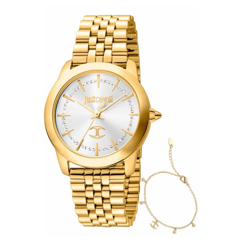 Just Cavalli Damenarmbanduhr aus der Kollektion Set emozioni mit CITIZEN GL34 Quarzwerk und reiner Zeitanzeige. Rundes, goldfarbenes Edelstahlgehäuse, 34 mm Durchmesser und 7 mm Dicke. Silbernes Zifferblatt mit analoger Anzeige, verziert mit Kristallen und goldfarbenen Strichindizes, horizontalem Logo oben, kratzfestem Mineralglas. Edelstahlarmband mit goldfarbener IP-Beschichtung und Druckknopf-Faltschließe. Wasserdicht bis 5 ATM: spritzwassergeschützt, aber nicht druckfest.