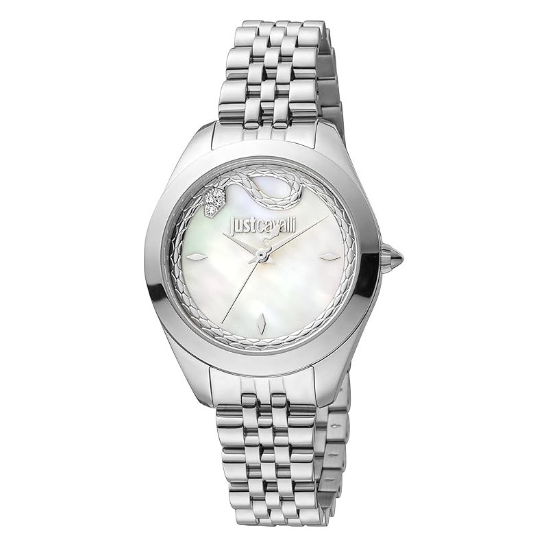 Just Cavalli Damenarmbanduhr aus der Logo-Kollektion mit Quarzwerk und reiner Zeitanzeige. Rundes, silberfarbenes Edelstahlgehäuse (32 mm Durchmesser, 10 mm dick) mit Schnappverschluss am Gehäuseboden. Antikes, weißes Perlmuttzifferblatt mit drei geometrischen Indizes, verziert mit einem silberfarbenen Schlangenmotiv und dem Logo auf der Oberseite. Mineralglas. Silberfarbenes Edelstahlarmband mit Faltschließe. Wasserdicht bis 5 ATM: spritzwassergeschützt, aber nicht druckfest.