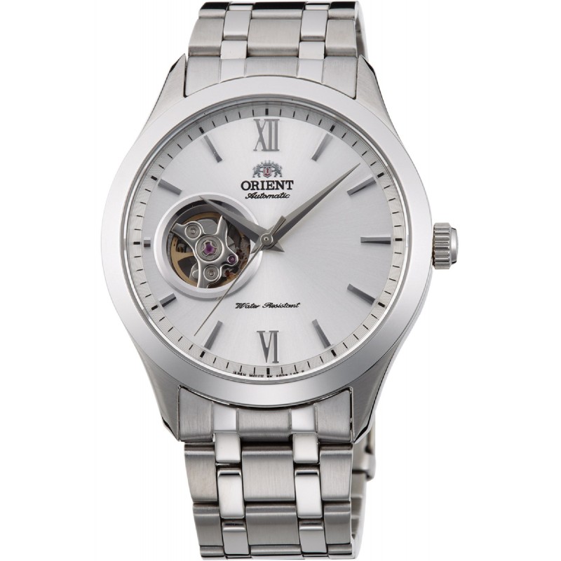 Orient Herrenarmbanduhr mit Automatikwerk und reiner Zeitanzeige. Rundes, silberfarbenes Edelstahlgehäuse, 39 mm Durchmesser und 11 mm dick, mit verschraubtem Glasboden. Silbernes Zifferblatt mit Strichindizes und römischen Ziffern nur bei 12 und 6 Uhr, sichtbares Uhrwerk, Logo oben, entspiegeltes Saphirglas. Silberfarbenes Edelstahlarmband mit Faltschließe, wasserdicht bis 5 ATM: spritzwassergeschützt, aber nicht druckfest.