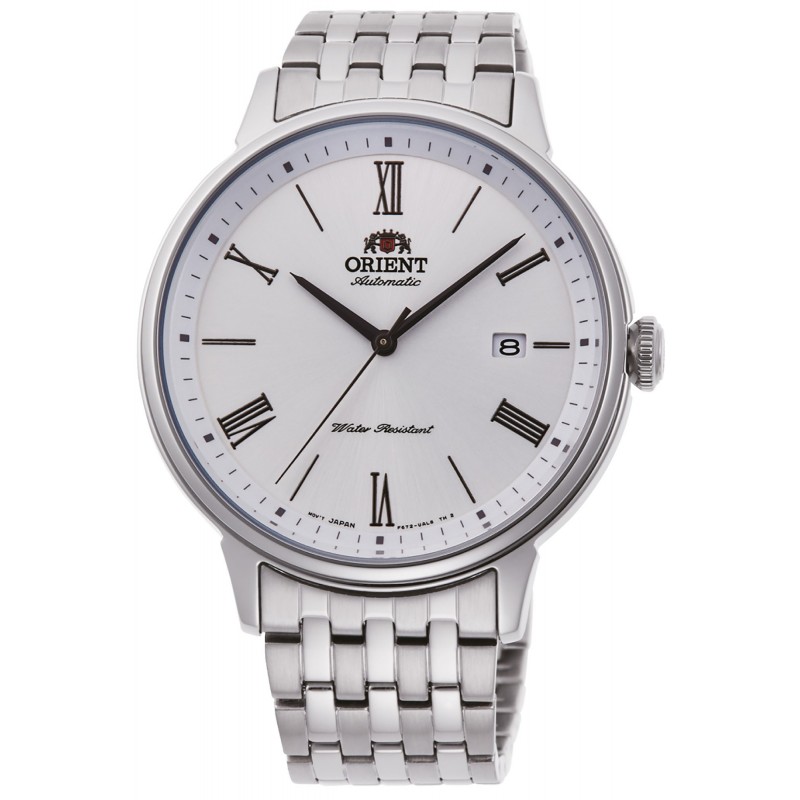 Orient Herrenarmbanduhr mit Automatikwerk und Datumsanzeige. Rundes, silberfarbenes Edelstahlgehäuse (43 mm Durchmesser, 12 mm dick), verschraubter Glasboden, feststehende silberfarbene Edelstahllünette. Weißes Zifferblatt mit Strichindizes und römischen Ziffern, Datumsanzeige bei 3 Uhr, Logo oben, gehärtetes Mineralglas. Silberfarbenes Edelstahlarmband mit Faltschließe, wasserdicht bis 5 ATM (spritzwassergeschützt, nicht druckfest).