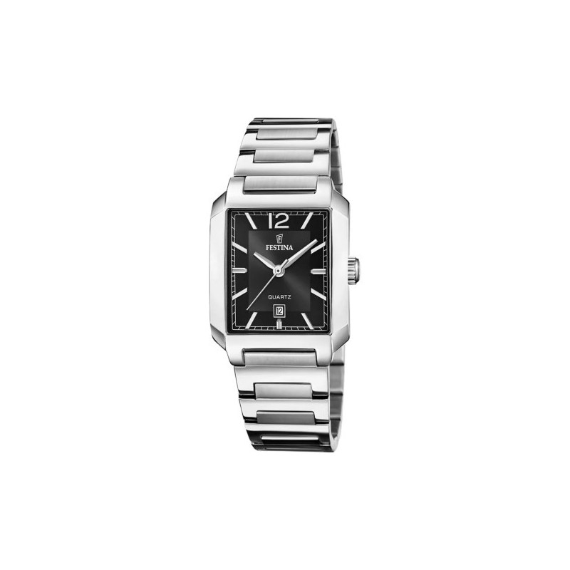 Festina Damenarmbanduhr aus der Kollektion „On the Square“ mit Quarzwerk und Datumsanzeige. Rechteckiges, silberfarbenes Edelstahlgehäuse, 33 mm Durchmesser und 8,5 mm dick. Schwarzes analoges Zifferblatt mit silberfarbenen Strichindizes und arabischer Ziffer bei 12 Uhr, Datumsanzeige bei 6 Uhr, Logo bei 12 Uhr, Mineralglas. Silberfarbenes Edelstahlarmband mit Druckknopf-Faltschließe, wasserdicht bis 5 ATM: spritzwassergeschützt, aber nicht druckfest.