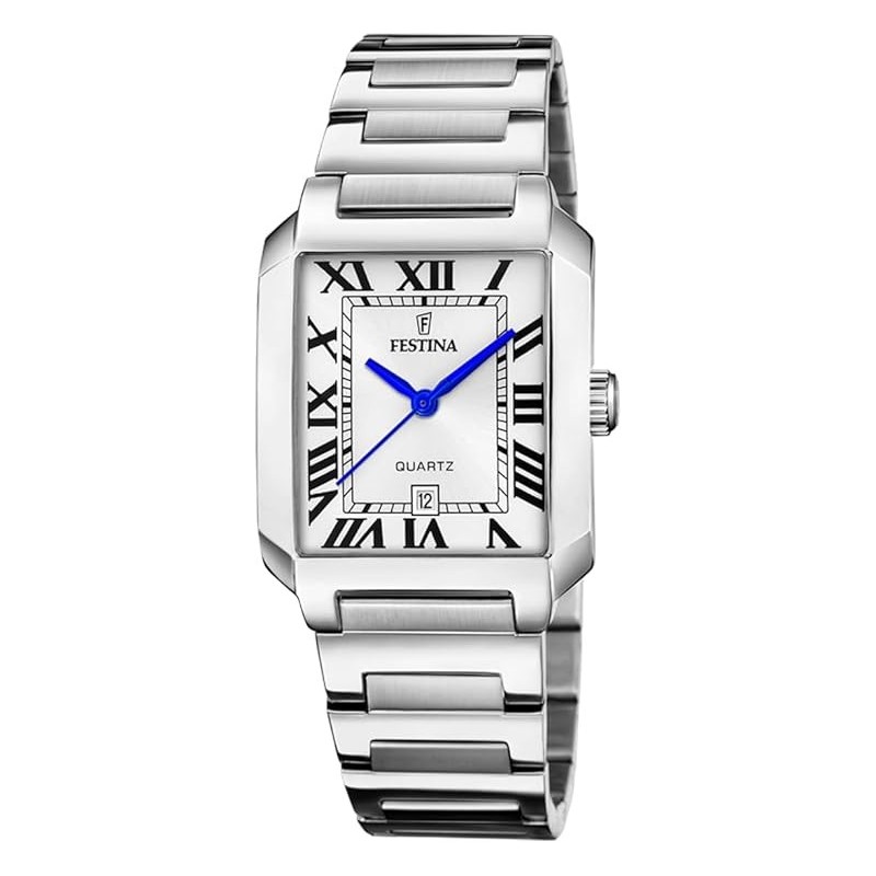 Festina Damenarmbanduhr aus der Kollektion „On the Square“ mit Quarzwerk und Datumsanzeige. Rechteckiges, silberfarbenes Edelstahlgehäuse, 33 mm Durchmesser und 8,5 mm dick. Weißes Zifferblatt mit analoger Anzeige, schwarzen römischen Ziffern, Datumsanzeige bei 6 Uhr, Logo oben, Mineralglas. Silberfarbenes Edelstahlarmband mit Faltschließe und Druckknopfverschluss. Wasserdicht bis 5 ATM: spritzwassergeschützt, aber nicht druckfest.