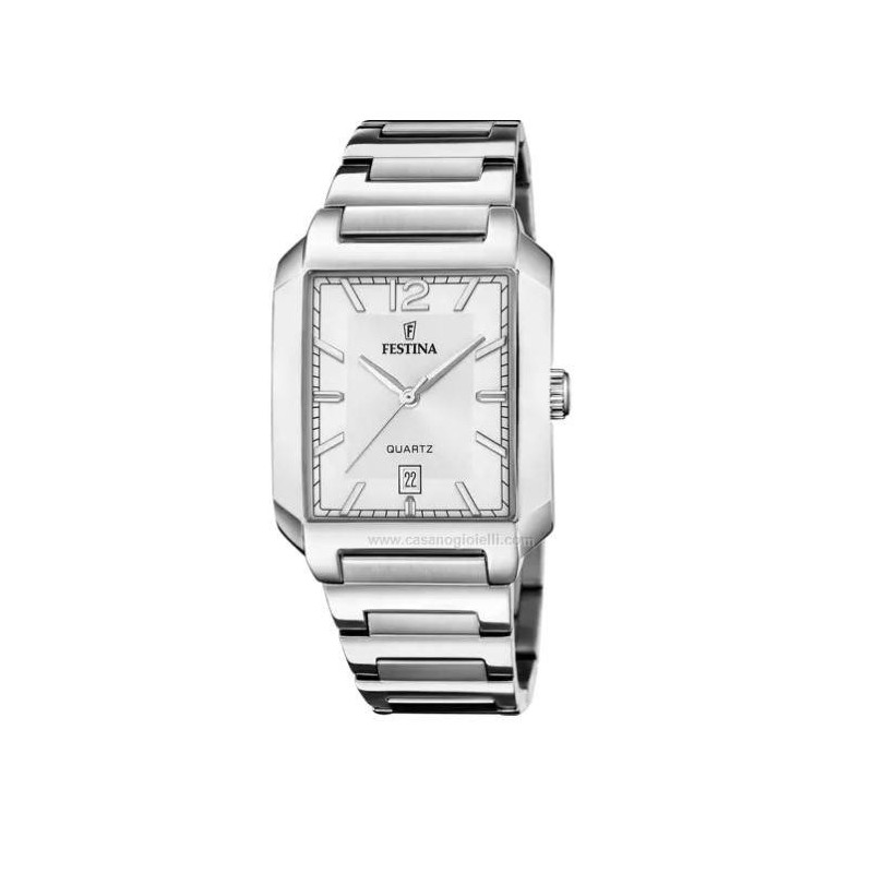 Festina Herrenarmbanduhr aus der Kollektion „On the Square“ mit Quarzwerk und Datumsanzeige. Rechteckiges, silberfarbenes Edelstahlgehäuse, 36 mm Durchmesser und 9 mm dick. Silbernes Zifferblatt mit analoger Anzeige, Strichindizes und arabischer Ziffer bei 12 Uhr, Datumsanzeige bei 6 Uhr, Logo oben, Mineralglas. Silberfarbenes Edelstahlarmband mit Faltschließe und Druckknopfverschluss. Wasserdicht bis 5 ATM: spritzwassergeschützt, aber nicht druckfest.