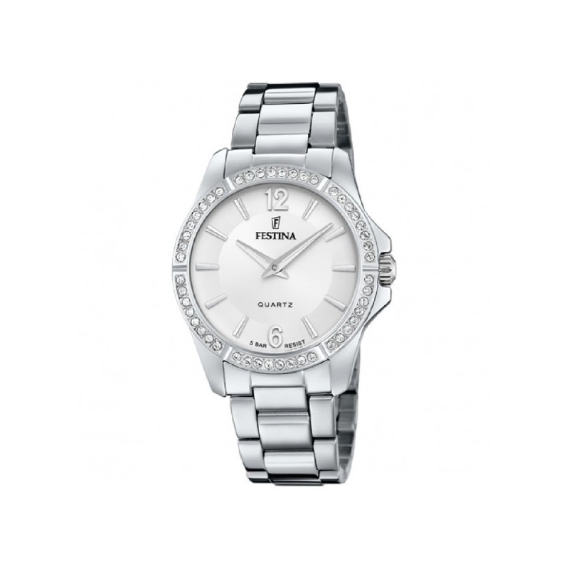 Festina Damenarmbanduhr aus der Mademoiselle Kollektion mit Quarzwerk und reiner Zeitanzeige. Rundes, silberfarbenes Edelstahlgehäuse (34 mm Durchmesser, 9,25 mm dick), verziert mit weißen Kristallen. Silbernes Zifferblatt mit analoger Anzeige, Strichindizes und arabischen Ziffern bei 12 und 6 Uhr, Logo oben, Mineralglas. Silberfarbenes Edelstahlarmband mit Druckknopf-Faltschließe, wasserdicht bis 5 ATM (spritzwassergeschützt, aber nicht druckfest).