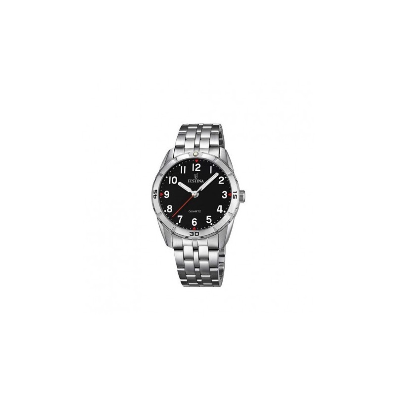 Festina Damenarmbanduhr aus der Junior Kollektion mit Quarzwerk M2035 und reiner Zeitanzeige. Rundes, silberfarbenes Edelstahlgehäuse (33 mm Durchmesser, 8,7 mm dick), silberfarbene Edelstahllünette mit Minuteneinteilung. Schwarzes analoges Zifferblatt mit weißen arabischen Ziffern, roten Akzenten und Logo oben, Mineralglas. Silberfarbenes Edelstahlarmband mit Druckknopf-Faltschließe, wasserdicht bis 5 ATM: spritzwassergeschützt, aber nicht druckfest.