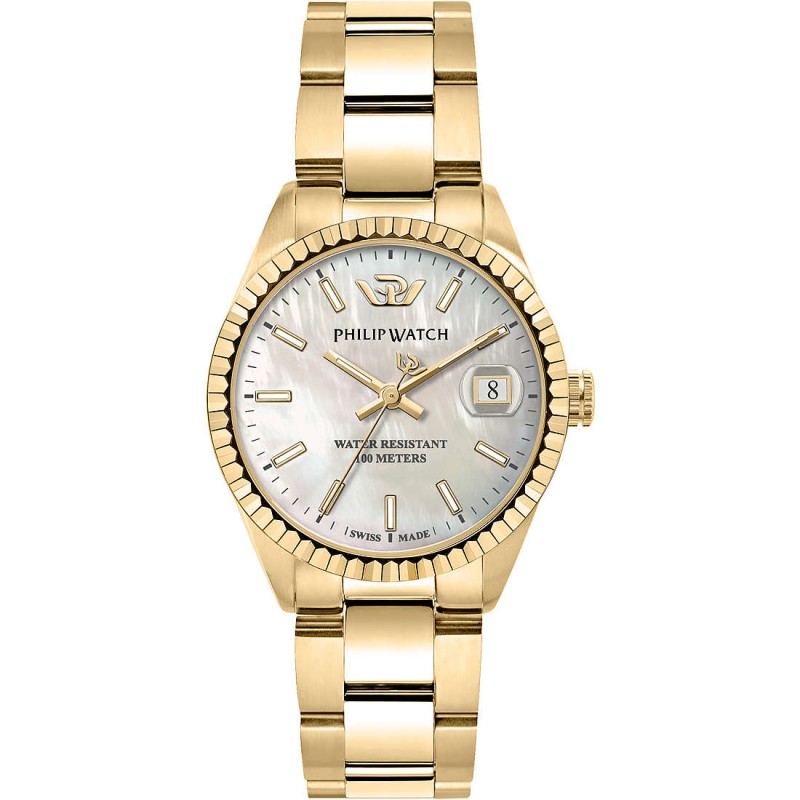 Philip Watch Tempo E Date Caribe Damenuhr aus Edelstahl mit goldfarbener PVD-Beschichtung. Das runde Gehäuse (35 mm Durchmesser, 9,15 mm Höhe) ist aus goldfarbenem Edelstahl gefertigt und mit entspiegeltem Saphirglas versehen. Das weiße Zifferblatt verfügt über goldfarbene Strichindizes, eine Zeit- und Datumsanzeige. Das Uhrwerk ist ein Quarzwerk aus der Schweiz. Das goldfarbene Metallarmband ist 18/16 Zoll breit und 176 mm lang. Es ist mit einer Doppelfaltschließe ausgestattet. Die Uhr ist bis 10 ATM wasserdicht.