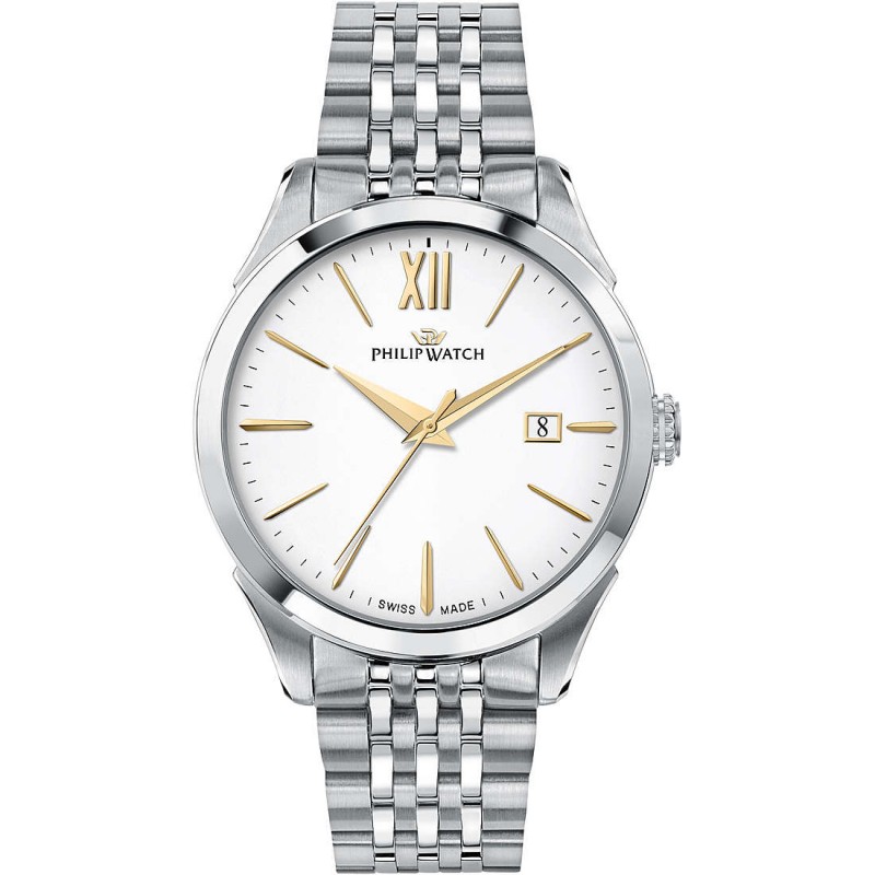 Philip Watch Nur-Herrenuhr aus der Roma-Kollektion mit rundem Gehäuse aus poliertem und satiniertem Stahl mit einem Durchmesser von 41 mm und Saphirglasmodell mit silberfarbenem Metallarmband und doppeltem Schmetterlingsverschluss mit Knöpfen mit weißem Zifferblatt mit goldfarbenen Strichindizes und Datum Funktion Quarzwerk mvt.ronda 1015 mit Swiss Made Zertifizierung und Wasserdichtigkeit von 5 atm.
