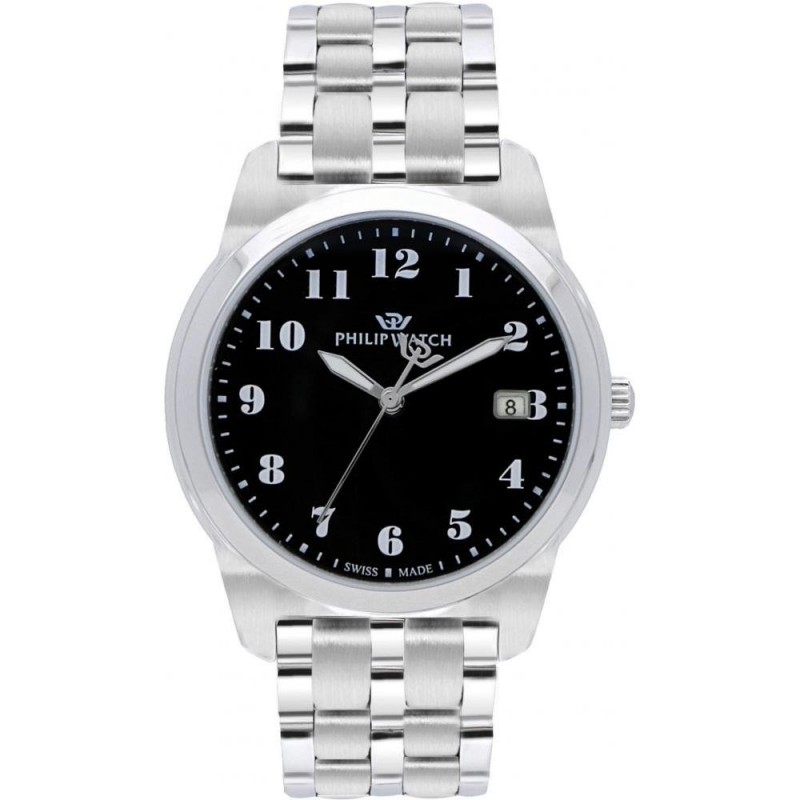 Philip Watch Timeless Classic R8253495003 Herren-Armbanduhr Analog mit Quarzwerk, silberfarbenes Edelstahlgehäuse mit 38 mm Durchmesser und 8,1 mm Dicke, schwarzes analoges Zifferblatt mit silberfarbenen Indizes in arabischen Ziffern, Datumsfunktion, Mineralglas mit Saphir-Behandlung und Silber- Tonfarbenes Edelstahlarmband mit Faltschließe mit Sicherheitsverschluss, 3 ATM wasserdicht, zertifiziertes Swiss Made