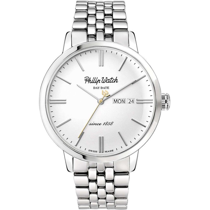 Philip Watch Nur-Zeituhr für Herren aus der Kollektion Grand Archive 1940. Uhr mit silberfarbenem 43-mm-Stahlgehäuse, verschraubter Krone und verschraubtem Gehäuseboden. Hellweißes analoges Zifferblatt mit silberfarbenen Strichindizes, Tages- und Datumsfunktion. Silberfarbenes Edelstahlarmband mit Druckknopf-Faltschließe Dieses Modell hat ein Quarzwerk und die Wasserdichtigkeit beträgt 3 ATM, zertifiziert in der Schweiz.