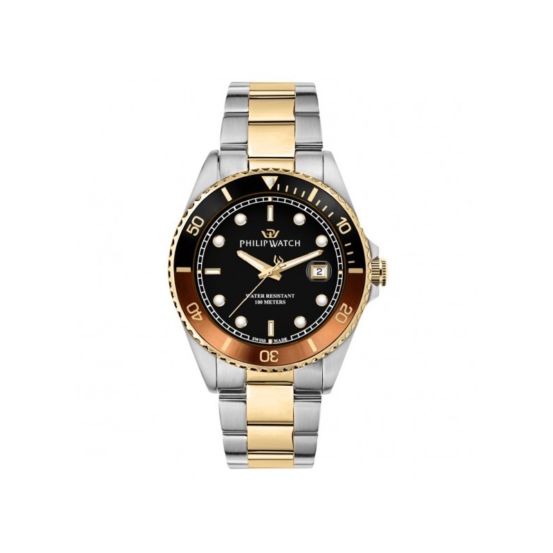 Philip Watch Herrenarmbanduhr aus der Caribe Sport Kollektion mit Ronda 1015 Schweizer Quarzwerk und Time-Only-Funktion mit Datum. Silberfarbenes Edelstahlgehäuse mit 42 mm Durchmesser und 11 mm Dicke, zweifarbige drehbare Lünette mit schwarzem und braunem Aluminiumeinsatz, verschraubter Gehäuseboden und verschraubte Krone, schwarzes analoges Zifferblatt mit applizierten geometrischen Indexen, Logo oben und Datumsanzeige bei 3 Uhr Uhr mit Lupe., Saphirglas. Zweifarbiges Gold- und Silberarmband mit Faltschließe mit Knöpfen, 10 ATM wasserdicht