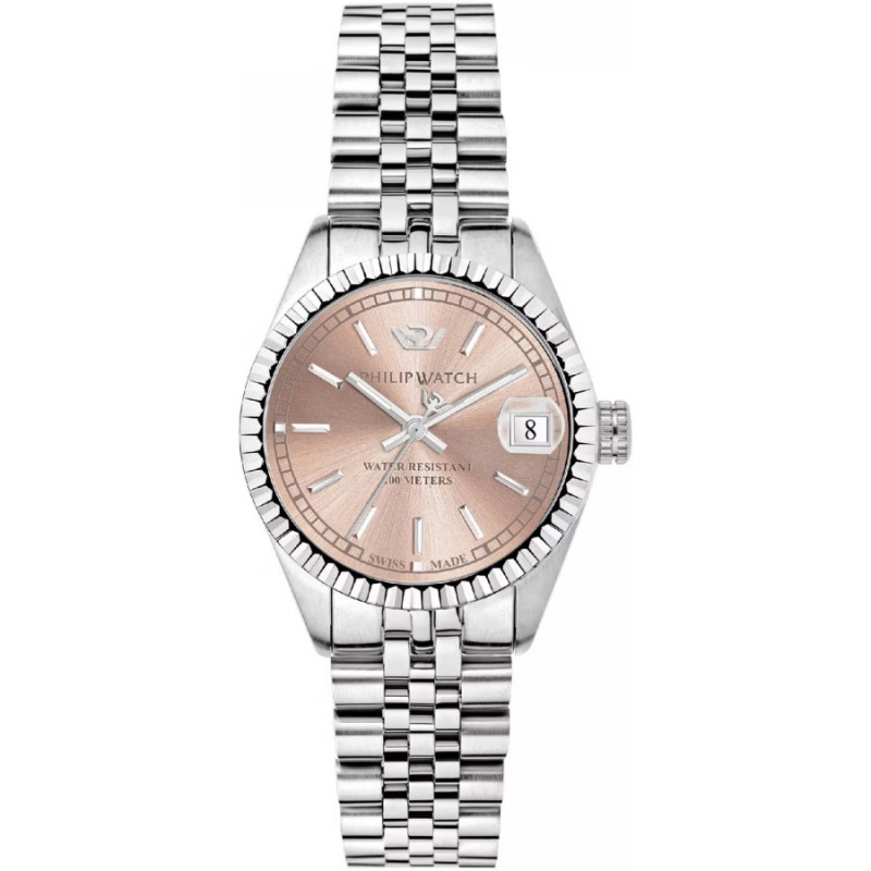 Damenarmbanduhr von Philip Watch aus der Caribe Urban-Kollektion mit Schweizer Quarzwerk F05.115 und Nur-Zeit-Funktionen mit Datum. Silberfarbenes Edelstahlgehäuse mit 31 mm Durchmesser und 9,15 mm Dicke, geriffelte Lünette, verschraubter Gehäuseboden und Krone, leuchtend rosafarbenes Zifferblatt mit Stabindizes, Logo bei 12 Uhr und Datum bei 3 Uhr mit Lupe, Saphirglas. Silberfarbenes Jubiläums-Mesh-Armband aus Edelstahl mit Druckknopf-Faltschließe, wasserdicht bis 10 ATM