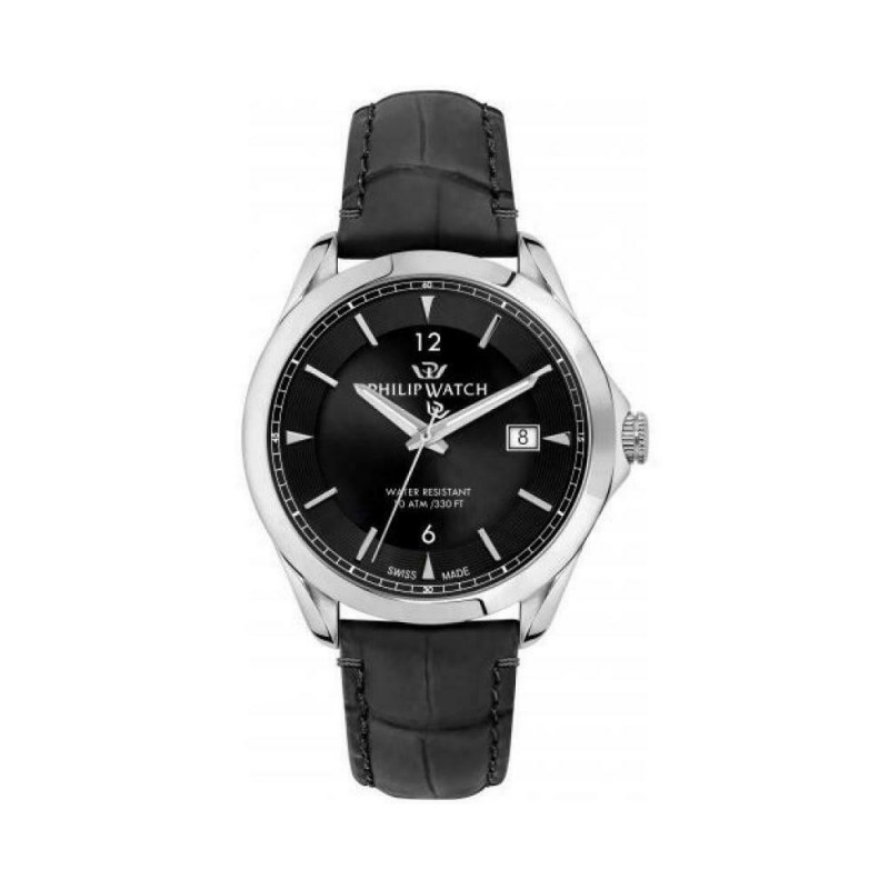 Philip Herrenuhr mit Lederarmband und schwarzem Zifferblatt. Das schwarze Lederarmband mit edler Krokodilprägung umschließt ein Edelstahlgehäuse mit Mineralglas. Das schwarze Zifferblatt mit Sonnenschliff besticht durch sein einzigartiges, konzentrisches Muster. Indizes und Zeiger sind farblich auf das silberfarbene Gehäuse abgestimmt. Schweizer Quarzwerk. Wasserdicht bis 10 ATM.