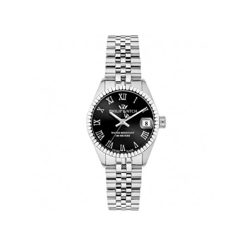 Philip Watch Damenarmbanduhr aus der Caribe Kollektion mit Schweizer Quarzwerk ETA F05.115 und Datumsanzeige. Silberfarbenes Edelstahlgehäuse mit Satin-Finish, 31 mm Durchmesser und 9,15 mm Dicke, geriffelte Lünette, verschraubter Gehäuseboden und Krone, schwarzes analoges Zifferblatt mit römischen Ziffern, Logo bei 12 Uhr und Datumsanzeige mit Lupe bei 3 Uhr, Saphirglas. Silberfarbenes Edelstahlarmband mit Faltschließe und Sicherheitsverschluss, wasserdicht bis 10 ATM.