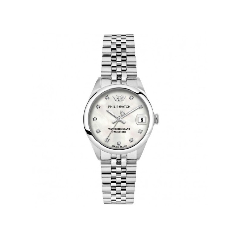Philip Watch Damenarmbanduhr aus der Caribe-Kollektion mit Schweizer Quarzwerk ETA F05.115 und Nur-Zeit-Funktionen mit Datum. Silberfarbenes Edelstahlgehäuse mit einem Durchmesser von 31 mm und einer Dicke von 9,15 mm, Lünette mit polierter Oberfläche, verschraubtem Gehäuseboden und verschraubter Krone, analoges Perlmuttzifferblatt mit Diamantindizes und Datum bei 3 Uhr mit Lupe , Saphirkristall. Silberfarbenes Edelstahlarmband mit Druckknopf-Faltschließe und Sicherheitsverschluss, 10 ATM wasserdicht.