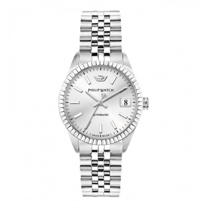 Philip Watch Damen-Automatikuhr aus der Caribe-Kollektion mit Sellita SW200 Automatikwerk und Datumsanzeige. Rundes, silberfarbenes Edelstahlgehäuse mit polierter und satinierter Oberfläche, 35 mm Durchmesser und 10,75 mm Dicke, gerändelte Stahllünette, verschraubte Krone und Gehäuseboden. Hellweißes Zifferblatt mit Strichindizes und Datumsanzeige bei 3 Uhr mit Lupe, Logo oben, Saphirglas. Silberfarbenes Jubilee-Mesh-Armband aus Edelstahl mit Faltschließe, Druckknöpfen und Sicherheitsverschluss. Wasserdicht bis 10 ATM.