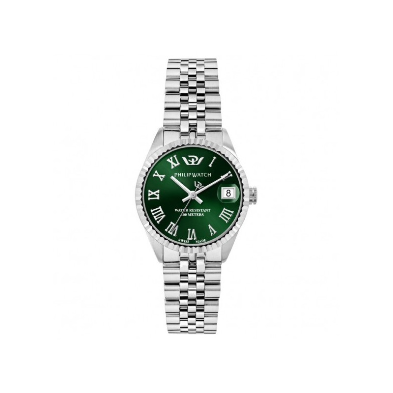 Philip Watch Damenarmbanduhr aus der Caribe Urban Kollektion mit ETA F05.115 Quarzwerk und Datumsanzeige. Rundes, silberfarbenes Edelstahlgehäuse mit 31 mm Durchmesser und 9,15 mm Dicke. Geriffelte Lünette. Verschraubter Gehäuseboden und verschraubte Krone für erhöhte Wasserdichtigkeit.
