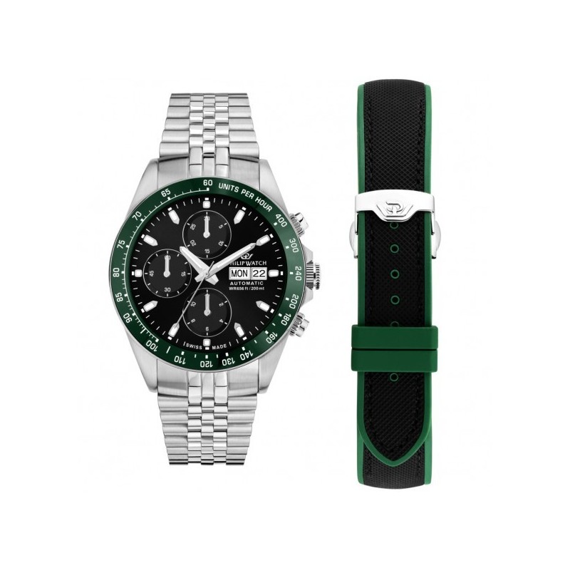 Philip Watch Herrenarmbanduhr aus der Caribe Diving Kollektion mit Sellitta SW500 Automatikwerk und Chronographenfunktion mit Datumsanzeige. Rundes, silberfarbenes Edelstahlgehäuse mit 42 mm Durchmesser. Grüne Lünette mit Keramikeinsatz. Schwarzes analoges Zifferblatt mit Strichindizes und Datumsanzeige bei 3 Uhr mit Wochentags- und Wochentagsanzeige, Logo oben, entspiegeltes Saphirglas. Silberfarbenes Edelstahlarmband mit Druckknopf-Faltschließe, zweites grün-schwarzes Silikonarmband mit Klickverschluss, wasserdicht bis 20 ATM.