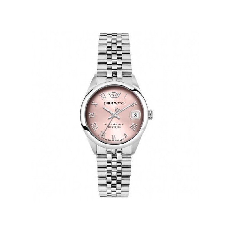 Philip Watch Damenarmbanduhr aus der Caribe Kollektion mit Quarzwerk und Datumsanzeige. Rundes, silberfarbenes Edelstahlgehäuse (39 mm Durchmesser, 9,15 mm dick) mit feststehender, polierter Lünette. Rosafarbenes Zifferblatt mit römischen Ziffern, Datumsanzeige bei 3 Uhr, Logo oben, entspiegeltes Saphirglas. Silberfarbenes Jubilee-Mesh-Armband aus Edelstahl mit polierter und satinierter Oberfläche, Faltschließe mit Sicherheitsverschluss, wasserdicht bis 10 ATM.