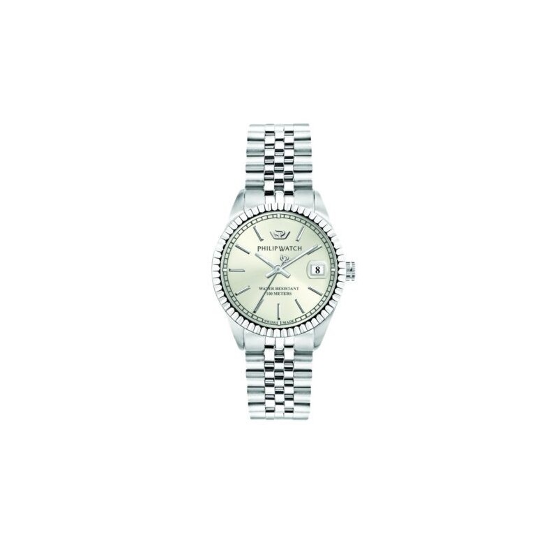 Philip Watch Damenarmbanduhr aus der Caribe Kollektion mit ETA F05.115 Quarzwerk und Datumsanzeige. Rundes, silberfarbenes Edelstahlgehäuse (35 mm Durchmesser) mit verschraubtem Gehäuseboden und Krone sowie gerändelter, silberfarbener Edelstahllünette. Silberfarbenes analoges Zifferblatt mit Strichindizes, Datumsanzeige bei 3 Uhr, Logo oben, Saphirglas. Silberfarbenes Jubilee-Mesh-Armband aus Edelstahl mit Druckknopf-Faltschließe und Sicherheitsverschluss, wasserdicht bis 10 ATM.