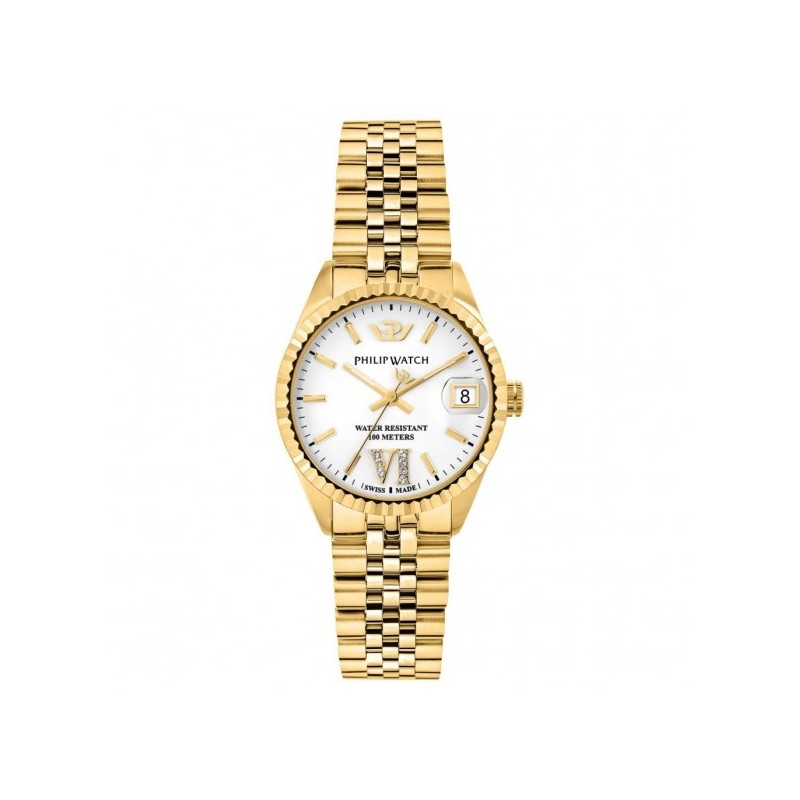 Philip Watch Damenarmbanduhr aus der Caribe Diamonds Kollektion mit ETA F05.115 Quarzwerk und Datumsanzeige. Rundes, goldfarbenes Edelstahlgehäuse mit 31 mm Durchmesser. Geriffelte Lünette.
