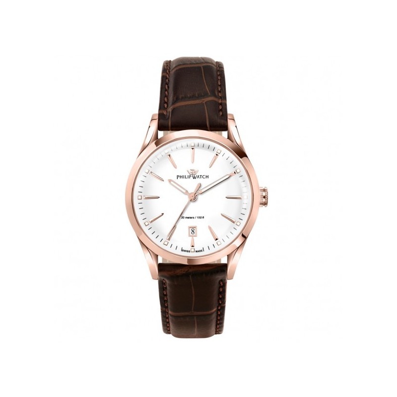 Philip Watch Herrenarmbanduhr aus der Sunray Kollektion mit Schweizer Quarzwerk und Datumsanzeige. Rundes, roségoldfarbenes Edelstahlgehäuse, 39 mm Durchmesser und 12,20 mm dick. Verschraubter Gehäuseboden. Weißes analoges Zifferblatt mit Strichindizes, Datumsanzeige bei 6 Uhr und Logo oben. Doppelt gewölbtes Mineralglas. Braunes Lederarmband mit Faltschließe. Wasserdicht bis 3 ATM: Spritzwassergeschützt, jedoch nicht unter Druck.