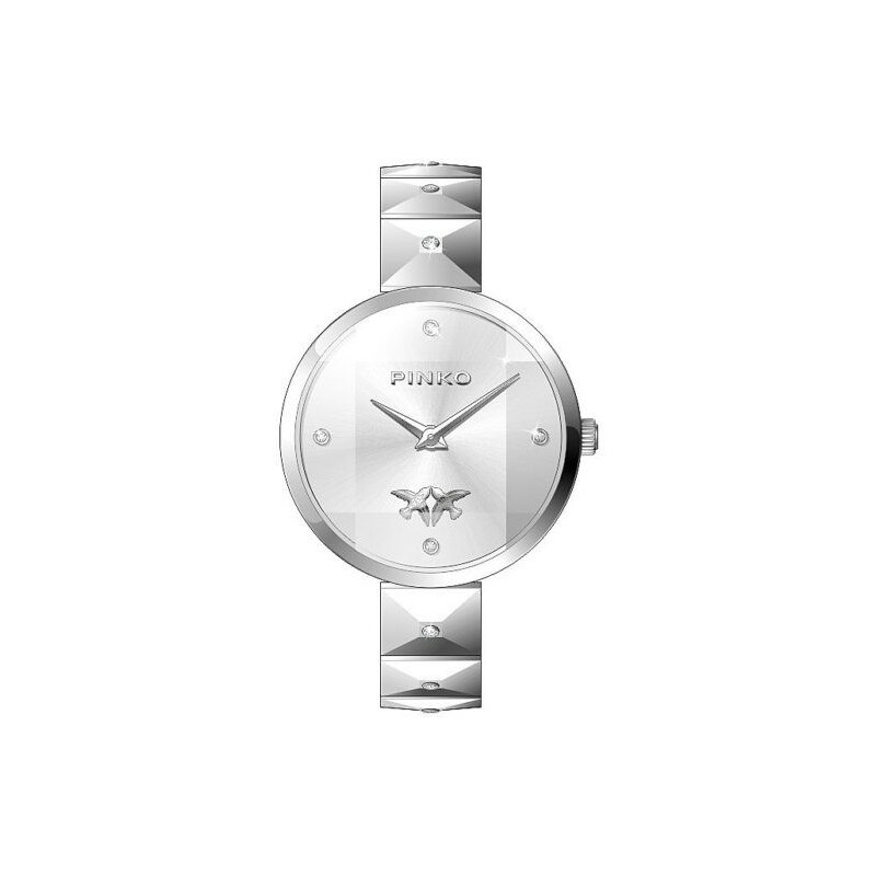 Pinko Damenarmbanduhr mit MYOTA2035 Quarzwerk und reiner Zeitanzeige. Rundes, silberfarbenes Edelstahlgehäuse (30 mm Durchmesser) mit Schnappdeckel. Silbernes Zifferblatt mit vier Steinindizes, Logo oben und Mineralglas. Silberfarbenes Edelstahlarmband mit aufgesetzten weißen Kristallen und Faltschließe. Wasserdicht bis 3 ATM: Spritzwassergeschützt, jedoch nicht druckfest.