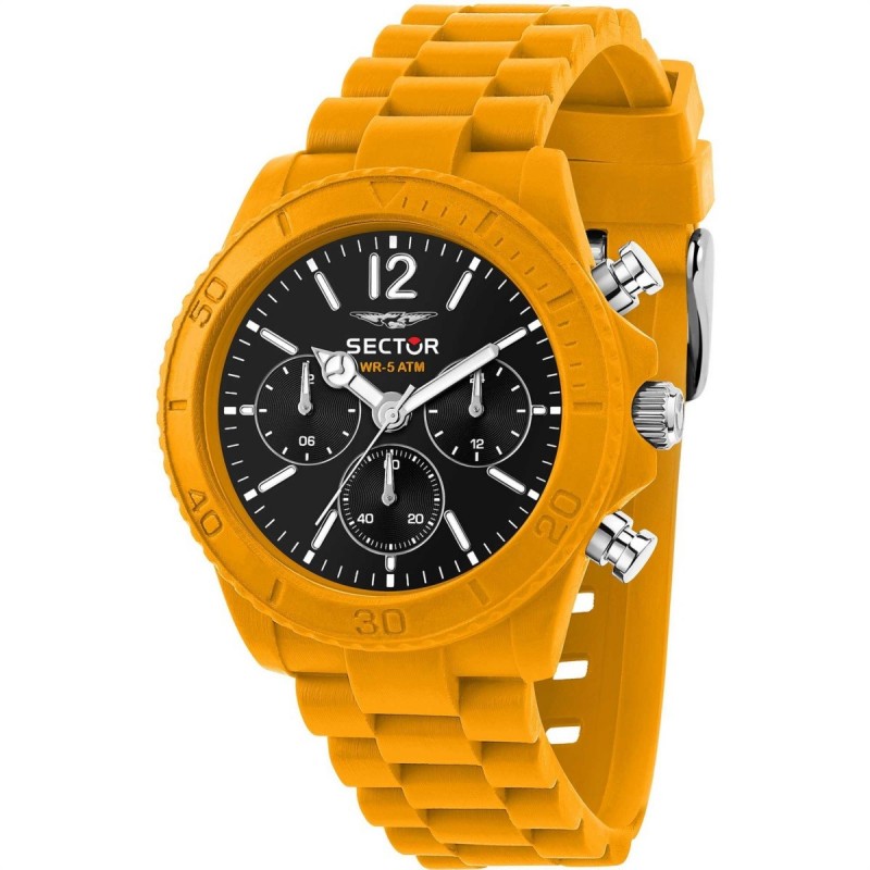 Sector Multifunktions-Herrenarmbanduhr aus der Diver-Kollektion mit Quarzwerk. Rundes orangefarbenes Nylongehäuse mit einem Durchmesser von 42 mm, orangefarbene Nylonlünette mit Minutenanzeige, schwarzes analoges Zifferblatt mit Strichindizes und arabischer Ziffer nur auf der 12-Position, Logo auf der Oberseite, Mineralglas. Orangefarbenes Kunststoffarmband mit Dornschließe, wasserdicht bis 5 ATM: beständig gegen Spritzwasser, aber nicht unter Druck.