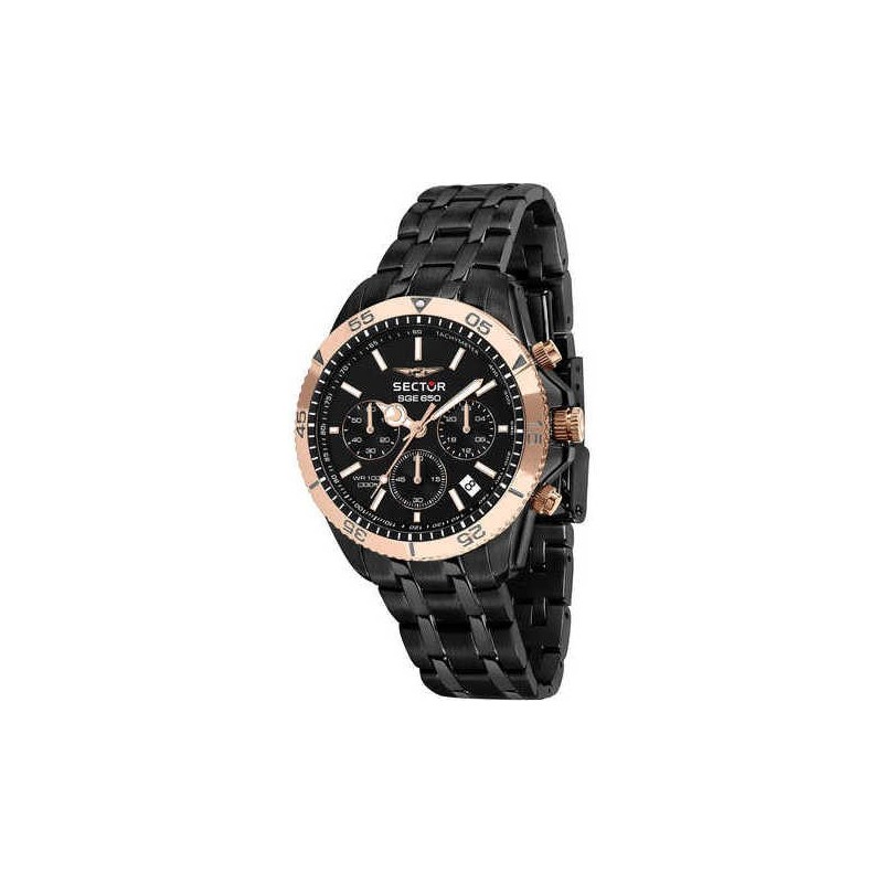 Sector Herrenarmbanduhr aus der Sge 650-Kollektion mit Quarzwerk und Chronographenfunktion mit Datum. Rundes Edelstahlgehäuse mit schwarzer IP-Behandlung, 42 mm Durchmesser und 12 mm Dicke, poliert und satiniert, roségoldfarbene Stahllünette mit Minutenanzeige, schwarzes Analogzifferblatt mit Stabindizes, Datumsfenster zwischen 4 und 5 Uhr , Logo auf der Oberseite, Mineralglas mit Saphirbehandlung. Edelstahlarmband mit schwarzer IP-Behandlung und Taucherschnallenverschluss mit Sicherheitsverschluss, 10 ATM wasserdicht.