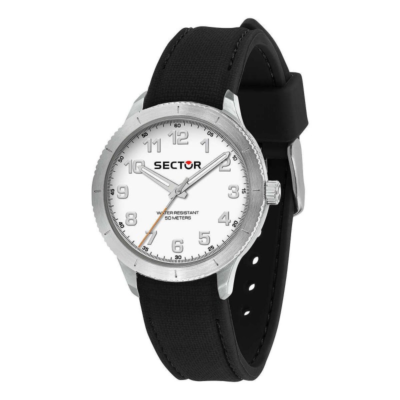 Sector-Damenarmbanduhr aus der 270-Kollektion mit Quarzwerk und Nur-Zeit-Funktion. Rundes silberfarbenes Edelstahlgehäuse mit einem Durchmesser von 44 mm und einer Dicke von 9,7 mm, weißes Analogzifferblatt mit silberfarbenen arabischen Ziffernindizes, Logo auf der Oberseite, Mineralglas. Schwarzes Kunststoffarmband mit Dornschließe, wasserdicht bis 5 ATM: beständig gegen Spritzwasser, aber nicht unter Druck.
