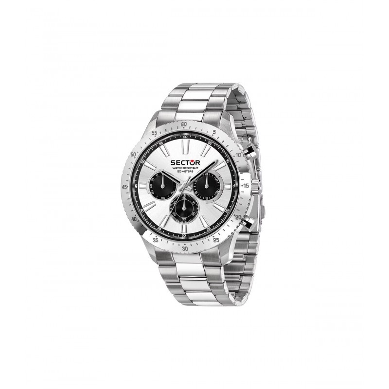 Sector Herrenarmbanduhr aus der Kollektion 270 mit Multifunktions-Quarzwerk. Rundes, silberfarbenes Edelstahlgehäuse, 45 mm Durchmesser und 12,50 mm dick. Silberfarbene Edelstahllünette mit Minuteneinteilung. Weißes analoges Zifferblatt mit Strichindizes, Logo oben, Mineralglas. Silberfarbenes Edelstahlarmband mit Druckknopf-Faltschließe, wasserdicht bis 5 ATM: spritzwassergeschützt, aber nicht druckfest.