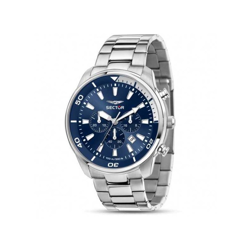 Herrenarmbanduhr von Sector aus der Oversize-Kollektion mit Quarzwerk, Chronographenfunktion und Datumsanzeige. Rundes, silberfarbenes Edelstahlgehäuse mit 48 mm Durchmesser und 12,2 mm Dicke. Blaues analoges Zifferblatt mit Strichindizes, Logo oben und Datumsanzeige zwischen 4 und 5 Uhr, Mineralglas. Silberfarbenes Edelstahlarmband mit Faltschließe und Sicherheitsverschluss, wasserdicht bis 10 ATM.