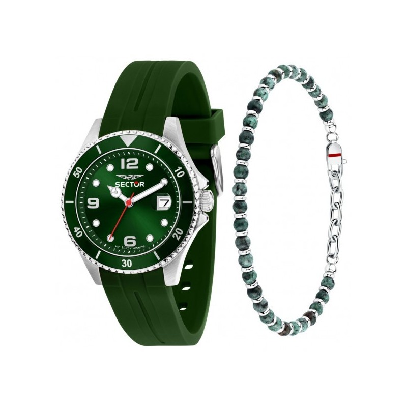 Grünes analoges Zifferblatt mit applizierten Indizes und Datumsanzeige bei 3 Uhr mit Lupe, Mineralglas. Grünes Lederarmband mit Dornschließe, wasserdicht bis 10 ATM. Ebenfalls im Lieferumfang enthalten ist das Sector-Stahlarmband aus der Kollektion 230 mit grünen Steinen und Karabinerverschluss.