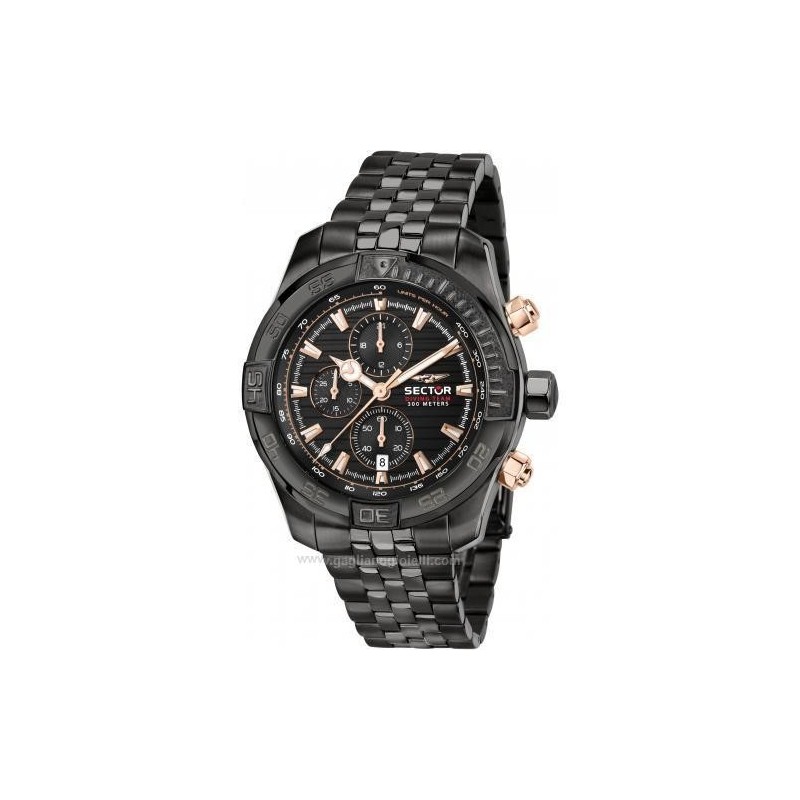 Sector Herrenarmbanduhr aus der Diving Team Kollektion mit Quarzwerk und Chronographenfunktion inklusive Datumsanzeige. Rundes, schwarzplattiertes Edelstahlgehäuse, 45 mm Durchmesser und 13,40 mm dick. Schwarzplattierte Lünette mit Minuteneinteilung. Schwarzes analoges Zifferblatt mit roségoldfarbenen Strichindizes, Datumsanzeige bei 6 Uhr, Logo bei 3 Uhr, Saphirglas. Schwarzplattiertes Edelstahlarmband mit Satin-Finish, Taucherfaltschließe und Sicherheitsverschluss, wasserdicht bis 30 ATM.