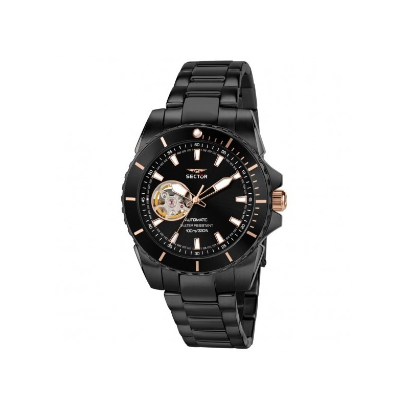 Sector Herrenarmbanduhr aus der Kollektion 450 mit TMI NH70 Automatikwerk und reiner Zeitanzeige. Rundes Edelstahlgehäuse mit schwarzer IP-Beschichtung, 43 mm Durchmesser und 12,95 mm Dicke. Schwarzes Zifferblatt mit freiliegendem Uhrwerk, Strichindizes und Logo am oberen Rand, Mineralglas. Edelstahlarmband mit schwarzer IP-Beschichtung, Druckknopf-Faltschließe mit Sicherheitsverschluss, wasserdicht bis 10 ATM.